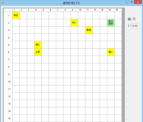 - これまで開発した連想モデルのMAMMでは,刺激語をもとに想起される単語しか表示できませんでした。そこで,想起される単語から,文章を想起できるように考えました。想起された複数の単語から,文章を構成するためには,これまでに用いてきた自己組織化マップによる方法を用いることができると考えました。つまり,ホップフィールドモデルに自己組織化マップを連動させるようにシステムの開発を考えました。このシステムは,キーワードや文章を自由に入力することにより,それに関わる文章を想起するというもので,教師が学習内容の関連事項を確認でき,授業設計に役立てることができると考えられます。このシステムは,2014.10に公表しました(日本教科教育学会第40回全国大会)。2015.10(日本教科教育学会第41回全国大会)には,想起されたキーワードが類似性していれば近くに配置されるように2次元のイメージマップに配置し視覚的にわかりやすくしました。
