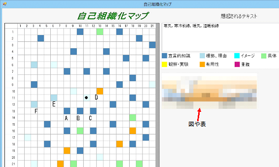 2017.9(日本教科教育学会第43回全国大会)と2017.12(平成29年度第4回日本科学教育学会研究会)においては,中学校第2学年の「気象とその変化」の内容を対象に,想起される内容を次の6つのカテゴリーに分けて表示するとともに,イメージや観察・実験については図が表示されるようにしました。これは授業設計において「具体-イメージ-抽象」の知識の関係が図れるように考えたためです。カテゴリーは,「a:一般的な説明のみ,b:根拠や理由を含む,c:有用性や意義を含む,d:イメージを含む,e:具体物がある,f:観察・実験を含む」の6つです。授業設計に役立てるとともに,今後このモデルをたたき台にしながら,人間の想起プロセスの解明にも役立てていきたいと考えています。