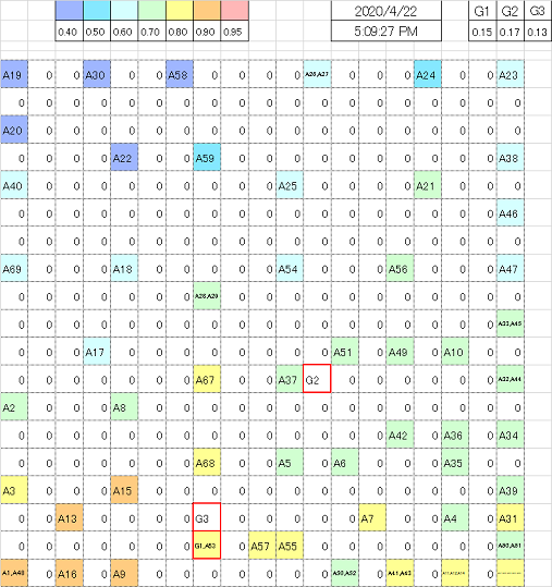 - 各学校では、学力調査や学習状況調査の結果を基に,学校の授業改善や学校の運営を行っています。その改善は,おもに各調査項目の数値の大小に基づくものが多いと思われます。当該の学校において学力と学習状況がどのように関連し,学校での取り組みが学力や学習状況に影響しているかといった効果の分析は難しいといえます。そこで,2019年から学力調査と学習状況調査の関連を分析し,学習指導や学習状況の改善を図るための情報が得られる分析システムの開発を行うことにしました。各学校で利用してもらうためにExcelで開発中です。分析システムではまず学習状況調査の回答を自己組織化マップに配置し、同じような回答の項目が近くに配置されるようにしました。その自己組織化マップに学力調査を位置付けるように考えています。しかし、学力調査の通過率と学習状況調査の評定尺度とは質的に異なります。そこで、数値幅を同じにしたり、座標軸を少しずつずらして適切な位置を求めるなど、現在試行しながら開発中です。下図のAに番号がついた項目が学習状況調査の項目で、Gに番号がついている項目が各学力調査です。