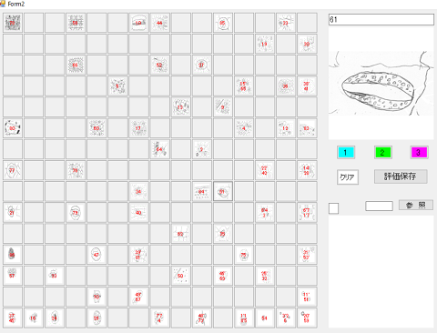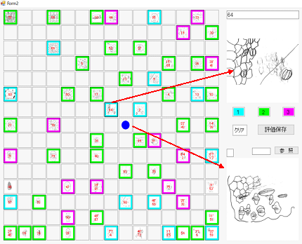 - これまでの研究では,自由記述などを自己組織化マップで分類したり評価したりしてきました。一方,理科では観察・実験のスケッチや自然事象をイメージで表現するなど,描画で表現することがよくあります。そこで,2016年に描画の分類や評価を行うシステムの開発とを考えました。まず,2016.8にExcelを用いて描画を分類できるものを開発しました(日本理科教育学会第66回全国大会)。そして,2016.10にはそれらをVisualBasicによって作成しました(日本教科教育学会第42回全国大会)。2017年にはそれら改善し,2018.8には描画の評価もできるようにしました(日本理科教育学会第68回全国大会)。システムは,自己組織化マップを用いて類似した描画が近くに配置されるようにしました。その際,ディープラーニングなどで用いられる,フィルタと畳み込みの考え方も取りいれました。下図は,気孔のスケッチが自己組織化マップで分類されたもので,それを教師が評価します。マップ(2番目の図)に配置された図のセルをクリックすると右の枠に拡大され、色のついた得点をクリックするとそのセルの枠に色がつき評価結果が記録されます。類似した描画が近くに配置されているので,教師は評価しやすくなります。また,評価されたマップができると,今度は,未評価の描画を読み込みこむことにより自己組織化マップに位置付けられます(3番目の図の「●」の位置)。位置付けられた近くのすでに評価された類似の描画を見ることにより,未評価の描画を評価することができます。開発においては,どのフィルタが適切であるかをいろいろと検討しました。その適切なフィルタは,たとえば観察するときの視点や留意点になると考えられ,指導に役立てていけるのではないかと思います。