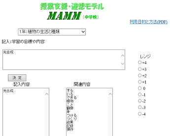 - ホップフィールドモデルについては,1999年(日本理科教育学会第49回全国大会)頃に,Exceを用いて想起に関するシミュレーションを行いました。それから数年用いましたが,その後しばらく用いていませんでした。しかし,学習や授業設計を行う際に,ある自然事象に関連する事項が想起されれば役立つと考え,web上で活用できるものを開発しました。とくに,理科の単元の評価規準をデータとして,単語の関連を分析し,単元を選択してキーワードや文章を入力すると,関連する単語を想起するモデルを作成し,2013.4に公開しました。研究内容については,2013.11に公表しました(日本理科教育学会北陸支部大会)。