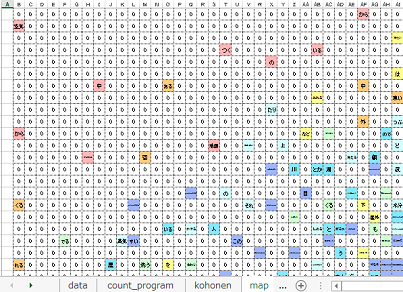 - 2003年頃から,各個人の点数のパターンや相互評価の点数などから,自己組織化マップを用いて学習者の類似度を分析しました。記述内容を分析したのは,2006.12(日本教科教育学会第32回全国大会)からで,記述内容の単語を自己組織化マップに配置しました。文章の形態素解析,重複単語の削除,各単語の数値化,自己組織化マップの作成等,各ステップごとにExcelを用いた分析ファイルがあり,各ステップで結果がでたらそのデータを次にというように,手動で行っていました。最初に分析したのは,生徒の観察・実験の記述内容です。2007.8(日本教科教育学会第32回全国大会)では,各分析ファイルをシートにし,関連づけて自動化し,ほぼ現在に近い分析方法を開発しました。そのときには,授業における教師の発話を分析しました。そこから2009.11(日本理科教育学会北陸支部大会)までは,授業分析に用いています。また,同時期に,教科書の内容の分析や,ワークシートの記述内容の分析などにも用いています。