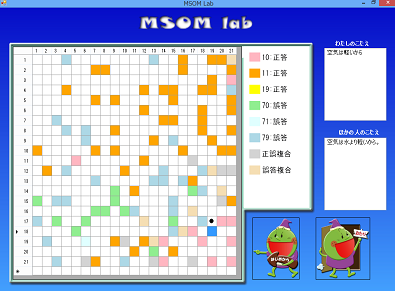 文章においては,前後において書いたものとか,2つの異なるクラスとか,予め大きなカテゴリーがある場合に,それがどのように自己組織化マップに分布しているかで,カテゴリー間の共通性や差異性が分析できます。そこで,カテゴリーごとにセルの色を変えて分析できるものを開発し,TM_MSOMCAとして,2014.11に公開しました。