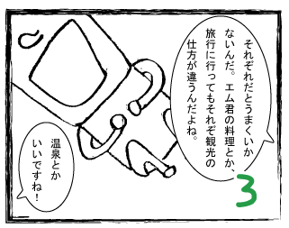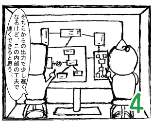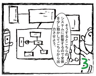 自己組織化マップは,全体的処理と分析的処理が調和するようにして作成されます。エム君は分析的処理が長けており,ソム君は全体的処理が長けているといった設定になっています。ここでは,どちらか片方だけではうまくいかず,両方が必要であることを物語として書くことにより,自己組織化マップに興味を持っていただくことを意図しています。物語は「▼」をクリックすると開きます。。